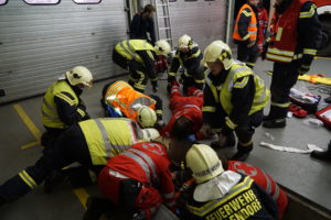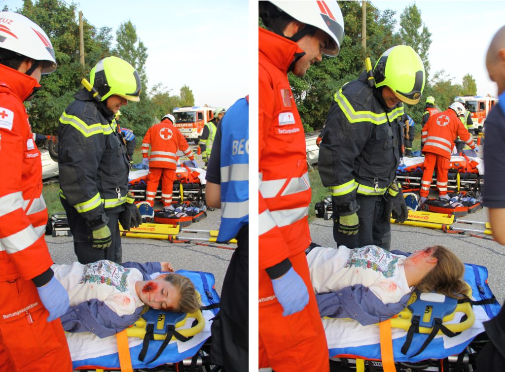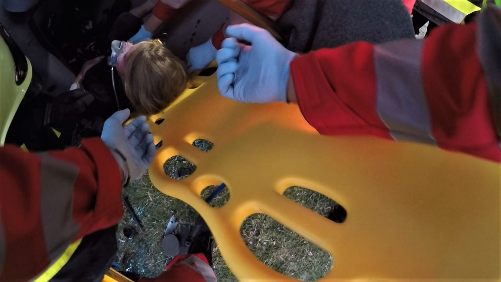 In der Zwischenzeit konnte die Tür geöffnet werden. Die erste Patientin wird auf eine Schaufeltrage gezogen und aus dem Unfallfahrzeug gerettet. Unmittelbar nach der Rettung auf die Schaufeltrage erhält die Patientin eine HWS-Schiene, danach wird sie in einer vorbereiteten Vakuummatratze immobilisiert und erneut evaluiert.