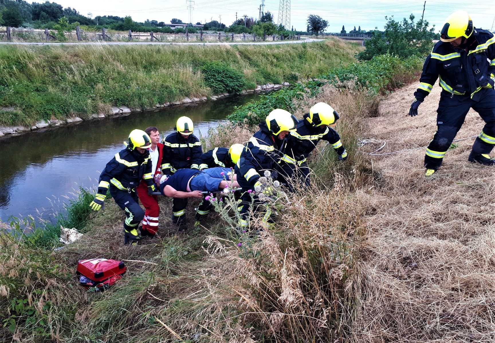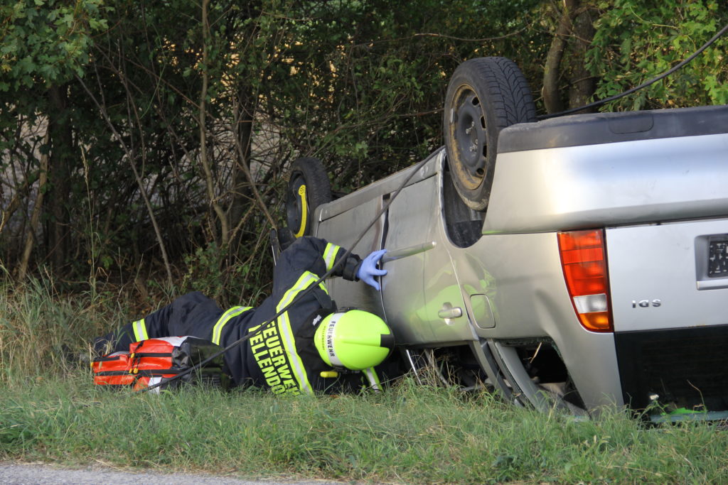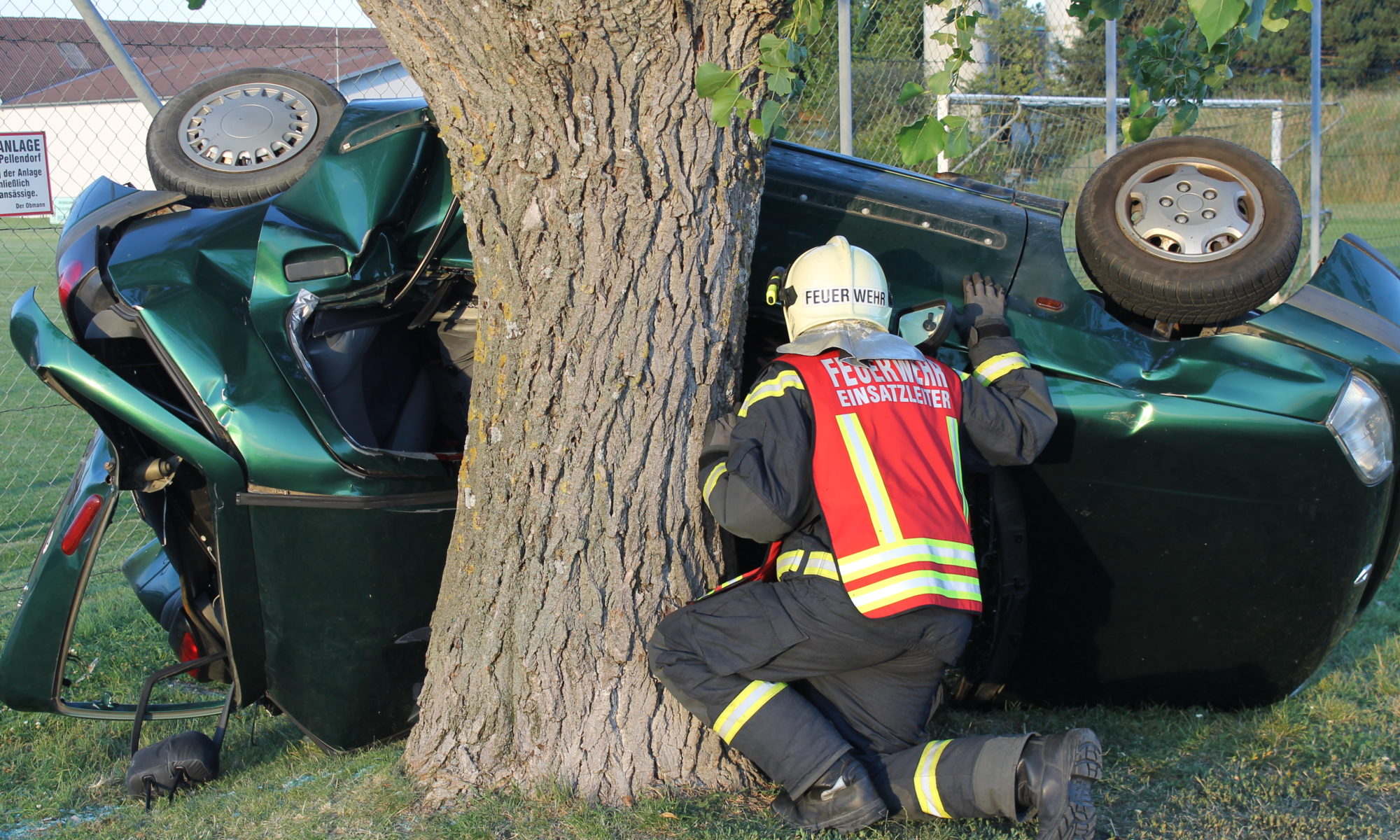 Ersteintreffende Einsatzorganisation ist die Feuerwehr Pellendorf. Der Einsatzleiter erkundet mit einem Feuerwehr-Ersthelfer die Einsatzstelle. Hierbei wird das Kabel übersehen. Der Feuerwehr Ersthelfer versucht Kontakt zu den Personen im PKW aufzunehmen, während sich der Einsatzleiter der Feuerwehr von der Stabilität und Sicherheit des Fahrzeuges überzeugt.