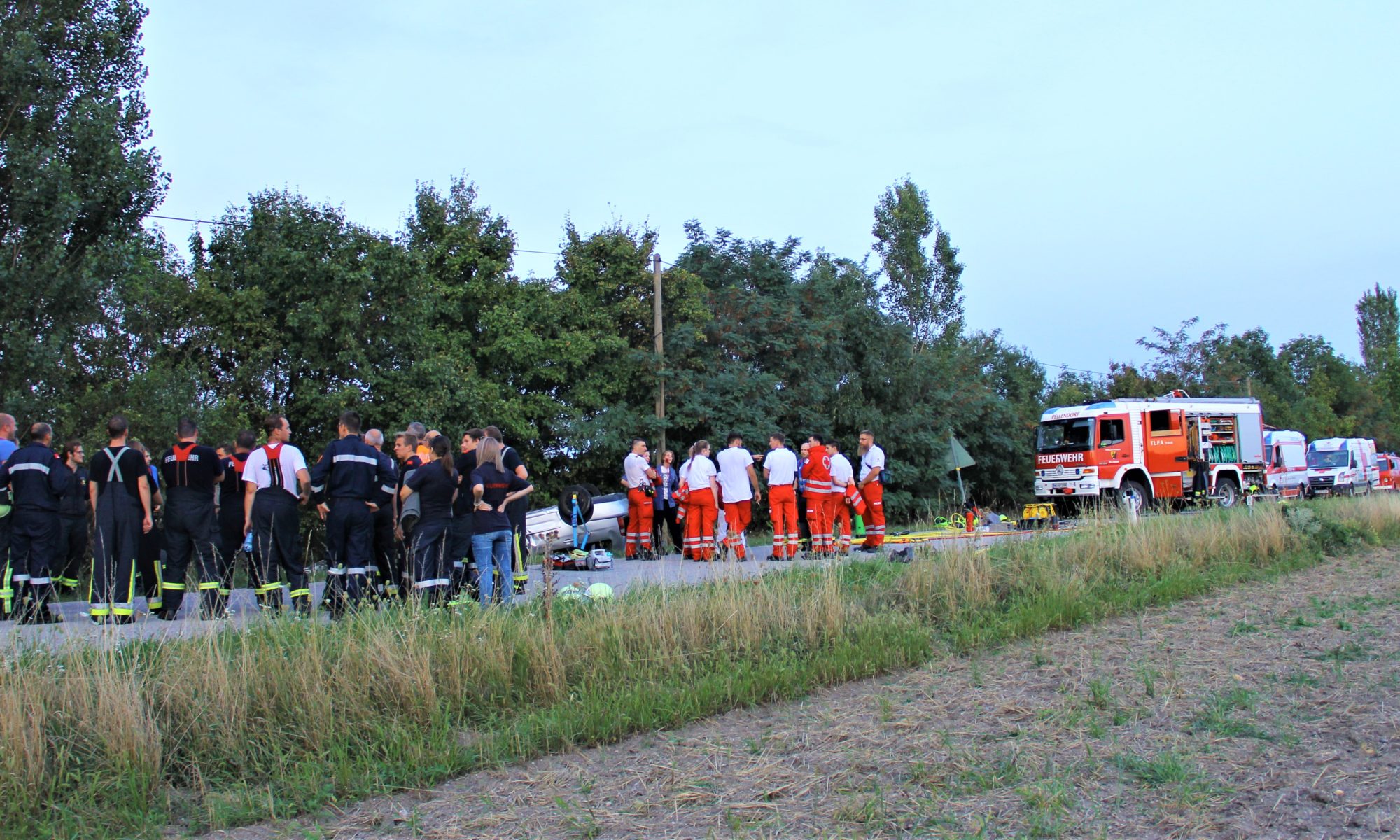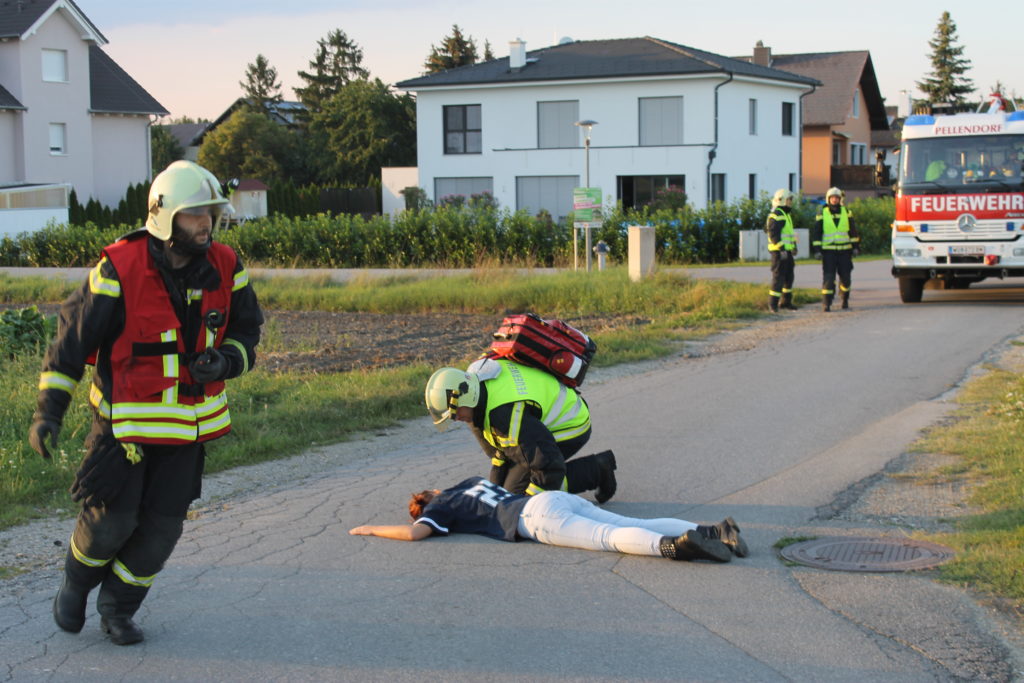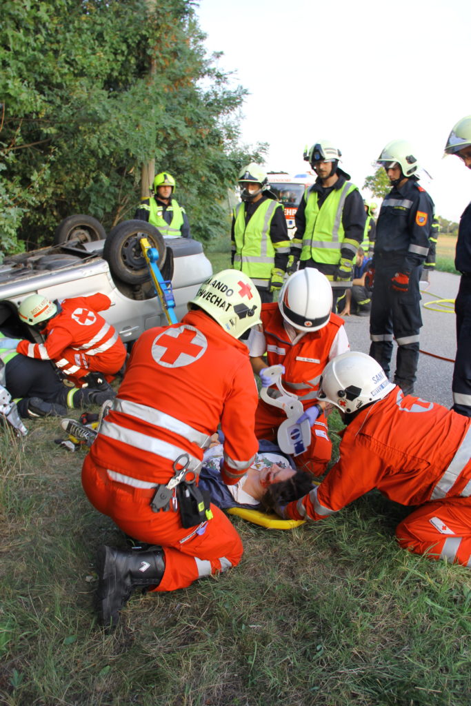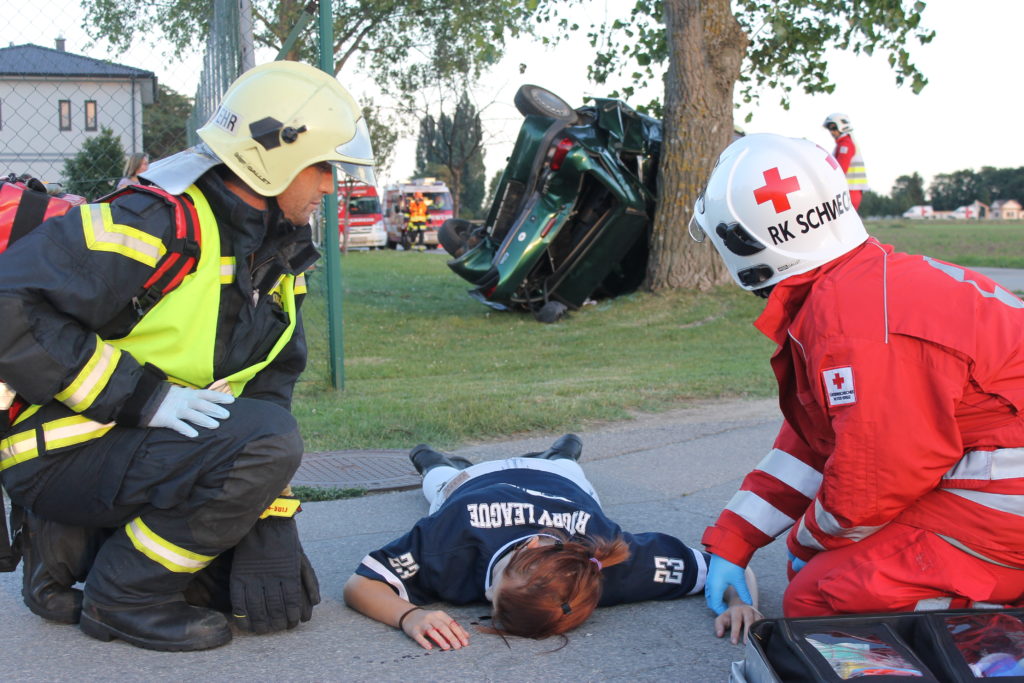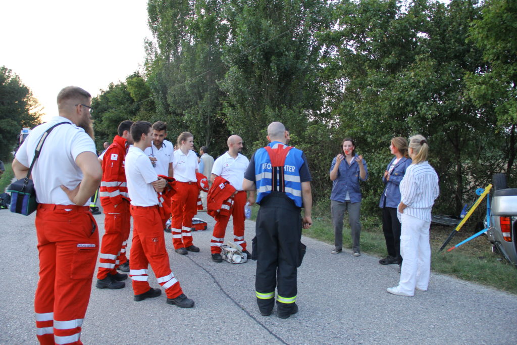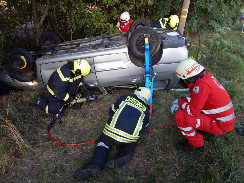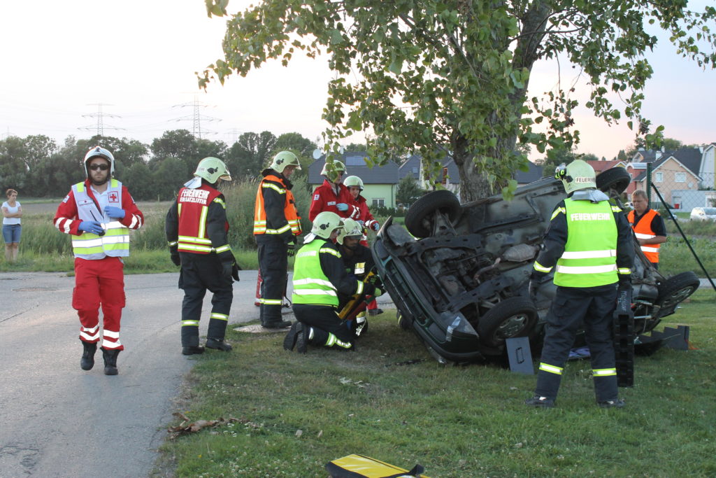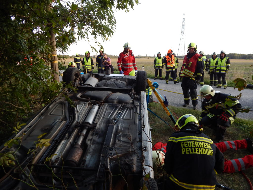 An einem heißen Sommertag kam es an der Landstraße zwischen Lanzendorf und Pellendorf zu einem folgenschweren Verkehrsunfall. Ein Fahrzeug mit drei Insassen kam ins Schleudern und landete im abschüssigen Straßengraben am Dach. Zuvor wurde die nicht angeschnallte Fahrerin durch das offene Fenster der Fahrertür geschleudert und landete hinter dem Windschutzgürtel, in welchem das Auto zu liegen kam, auf dem angrenzenden Acker. Die Fahrerin wurde entsprechend dem Unfallmechanismus als Polytrauma dargestellt. Sie ist bewusstlos aufgrund eines schweren Schädel-Hirn-Traumas. Die beiden anderen Insassen verblieben im Fahrzeug. Die Beifahrerin ist durch ihren Sitz eingeklemmt, mit ihrem Körper allerdings an der Windschutzscheibe liegend. Die zweite Insassin wird durch Beifahrersitz und hinterer Sitzbank bedrängt. Rund um die Unfallstelle liegen Frackteile des Unfallfahrzeuges. Von der Stoßstange, einem Reifen bis hin zu Kleinteilen. Durch die Wucht des Aufpralls riss außerdem ein Stromkabel eines Leitungsmasten, welcher erwischt wurde (Achtung, nicht besonders realistisch, aber ein wichtiges Lernfeld im Falle).