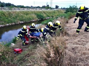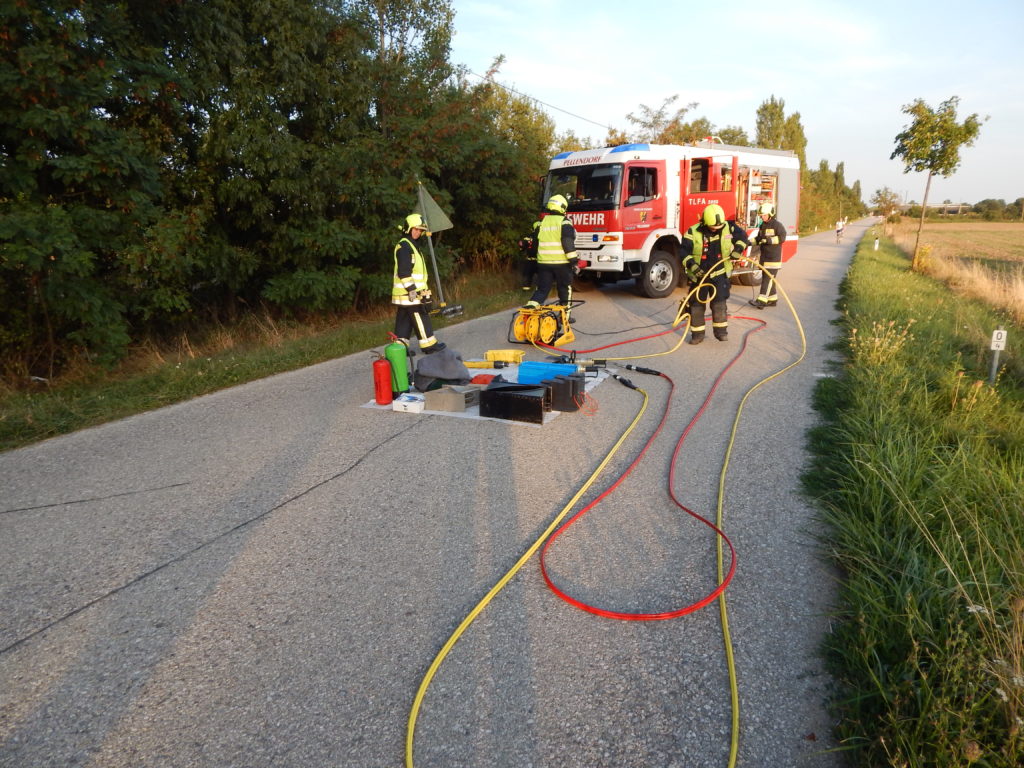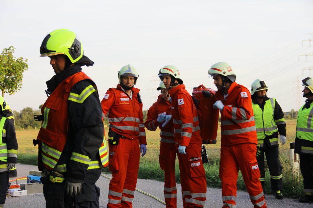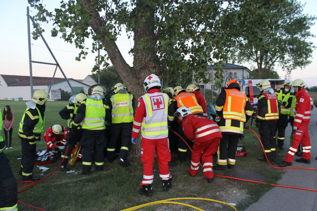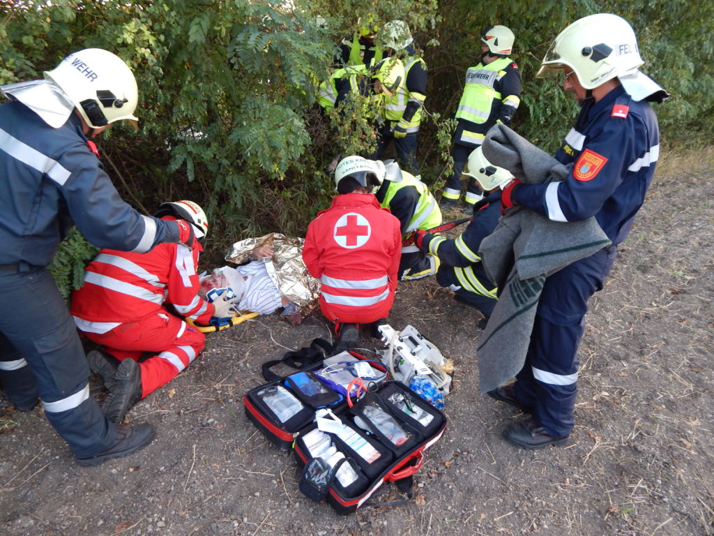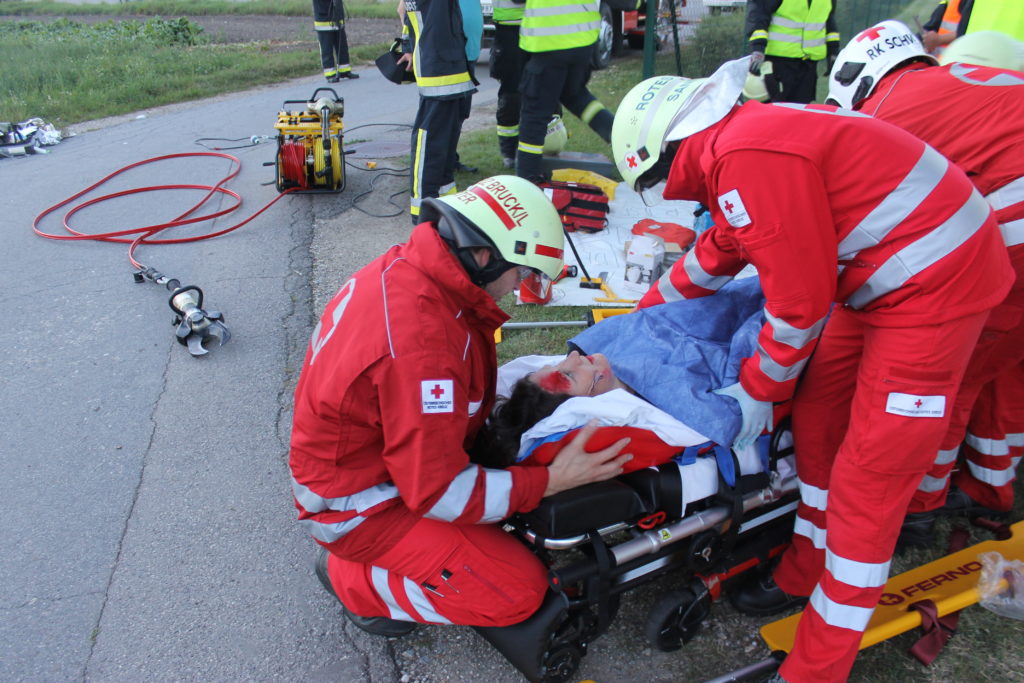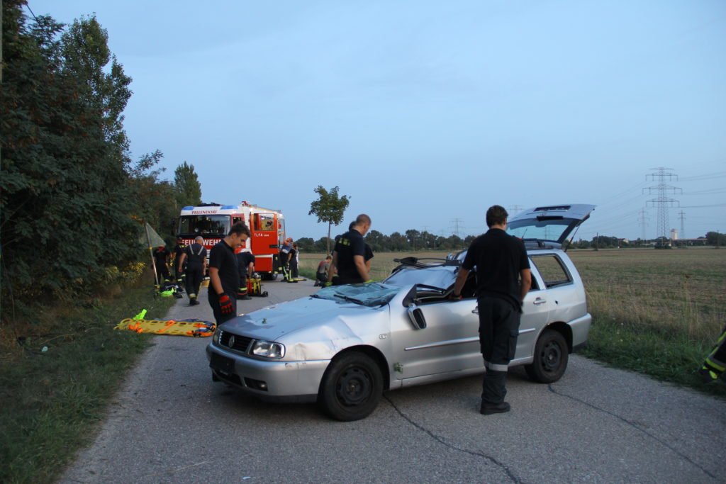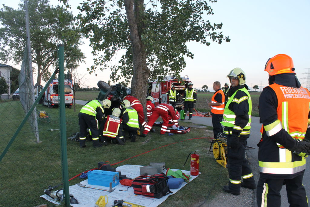 An einem heißen Sommertag kam es an der Landstraße zwischen Lanzendorf und Pellendorf zu einem folgenschweren Verkehrsunfall. Ein Fahrzeug mit drei Insassen kam ins Schleudern und landete im abschüssigen Straßengraben am Dach. Zuvor wurde die nicht angeschnallte Fahrerin durch das offene Fenster der Fahrertür geschleudert und landete hinter dem Windschutzgürtel, in welchem das Auto zu liegen kam, auf dem angrenzenden Acker. Die Fahrerin wurde entsprechend dem Unfallmechanismus als Polytrauma dargestellt. Sie ist bewusstlos aufgrund eines schweren Schädel-Hirn-Traumas. Die beiden anderen Insassen verblieben im Fahrzeug. Die Beifahrerin ist durch ihren Sitz eingeklemmt, mit ihrem Körper allerdings an der Windschutzscheibe liegend. Die zweite Insassin wird durch Beifahrersitz und hinterer Sitzbank bedrängt. Rund um die Unfallstelle liegen Frackteile des Unfallfahrzeuges. Von der Stoßstange, einem Reifen bis hin zu Kleinteilen. Durch die Wucht des Aufpralls riss außerdem ein Stromkabel eines Leitungsmasten, welcher erwischt wurde (Achtung, nicht besonders realistisch, aber ein wichtiges Lernfeld im Falle).