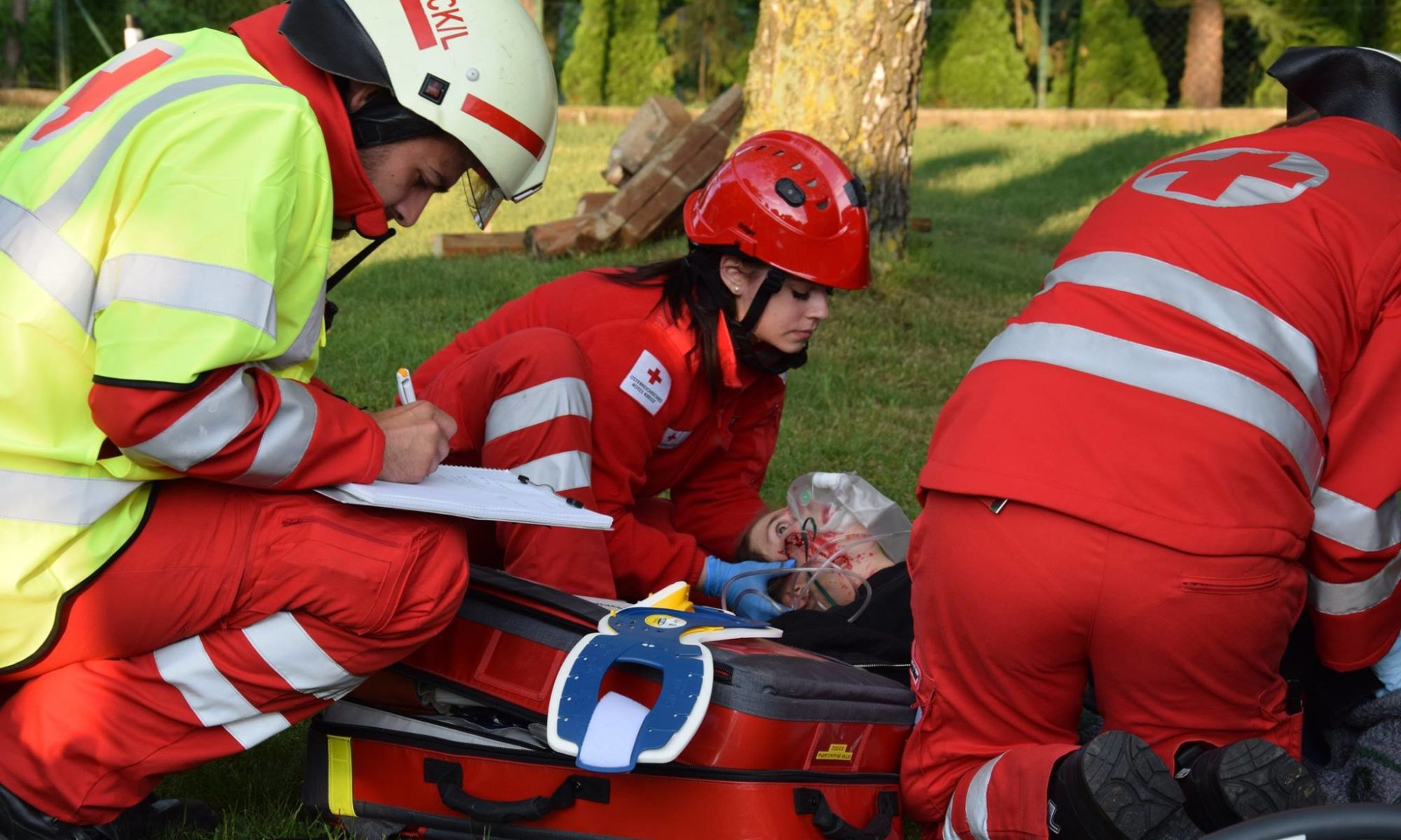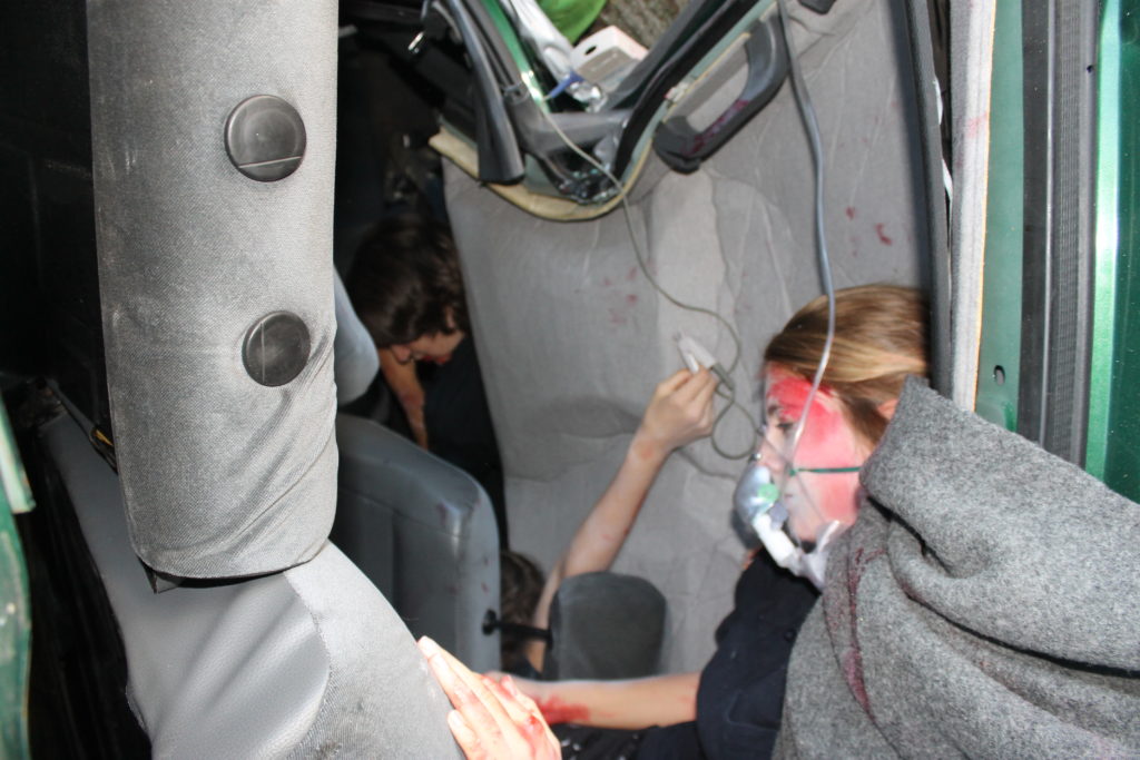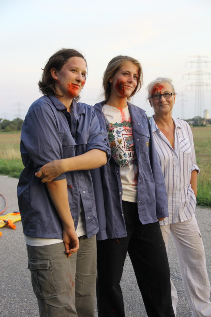 Realistische Notfalldarstellung drei Darstellern, selbst geschminkt