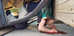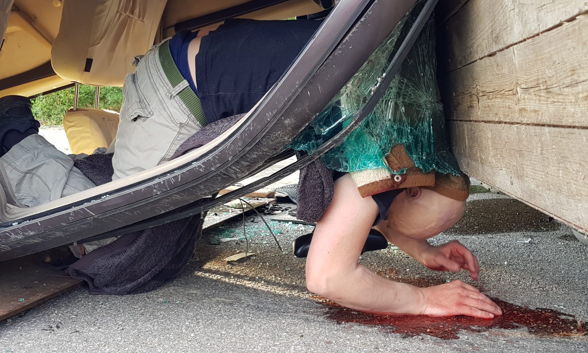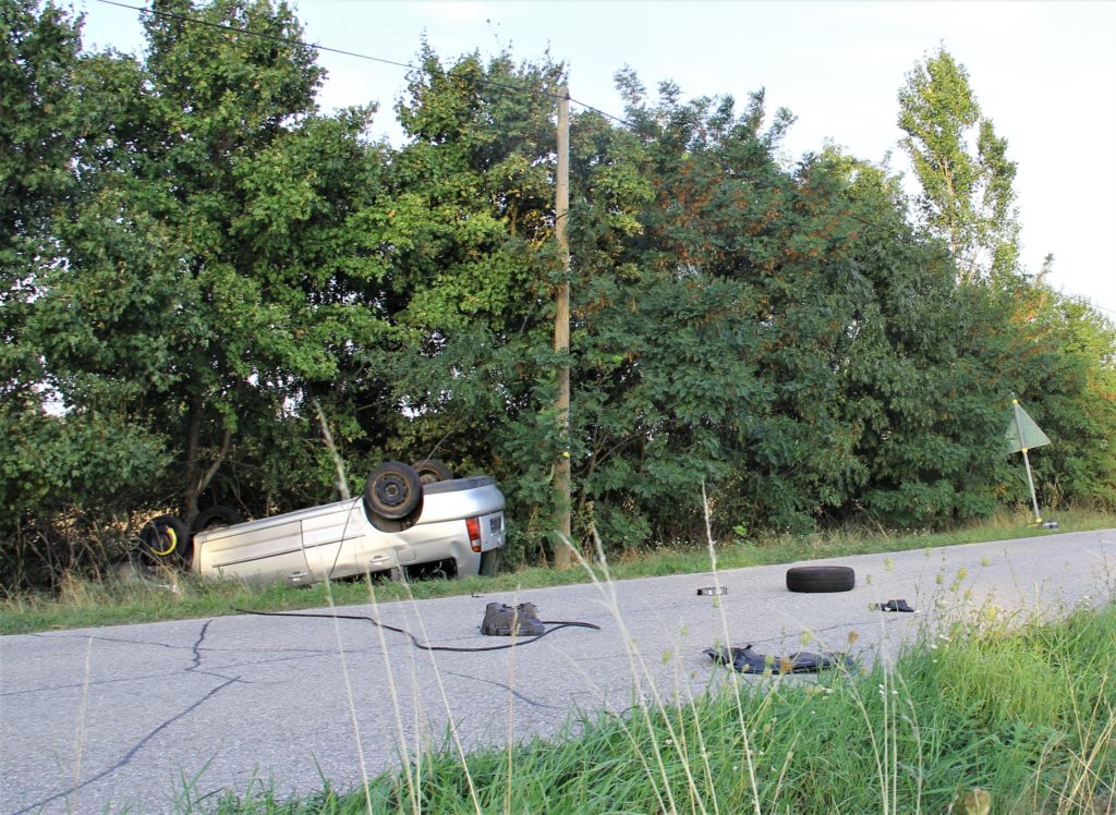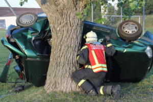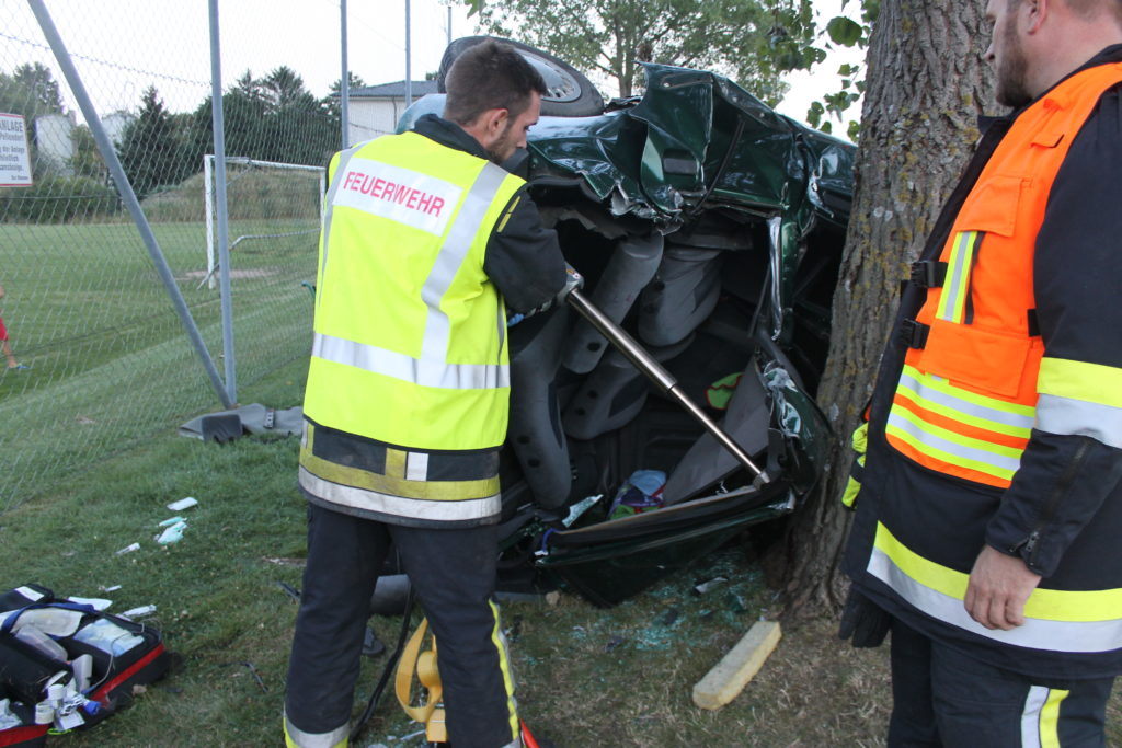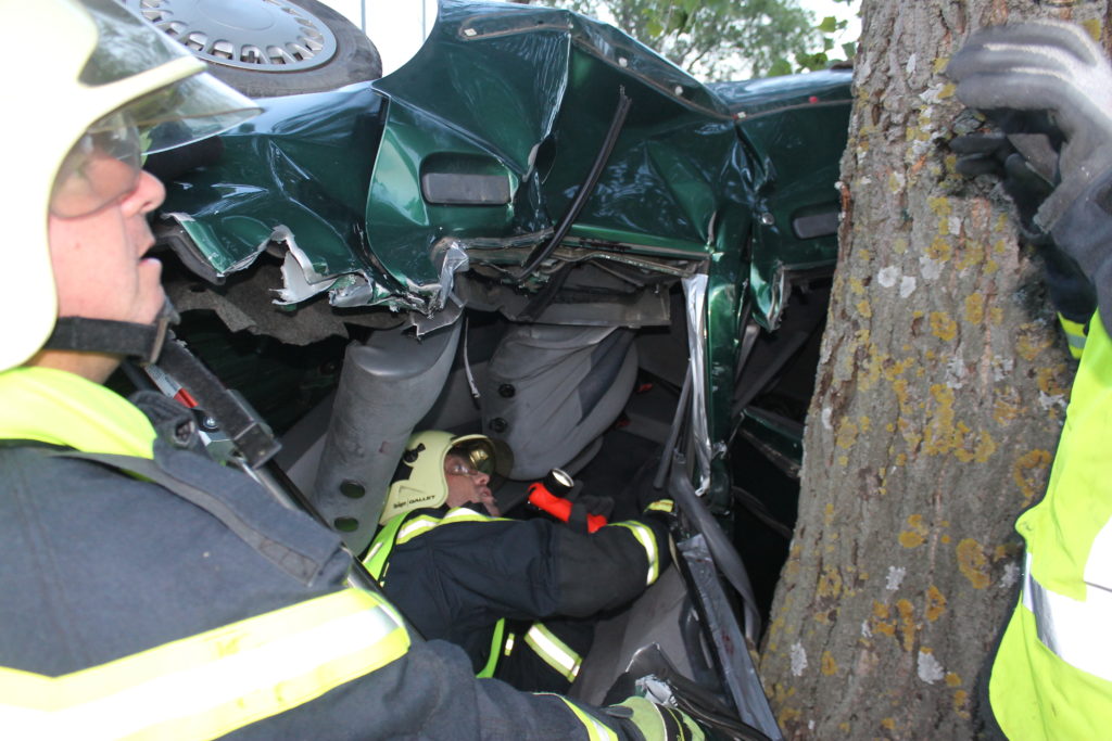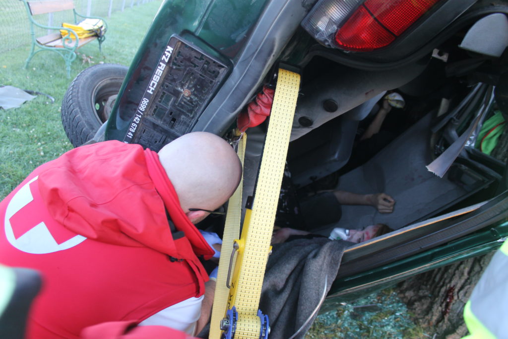Ein mit vier Frauen besetzter PKW kam mit hoher Geschwindigkeit aufs Straßenbankett und überschlug sich mehrfach. Der PKW bleibt seitlich an einen Baum anligend zum Stillstand. Zu diesem Zeitpunkt befinden sich nur noch drei Personen im Fahrzeug, eine davon ist nicht mehr ansprechbar, die fehlende Person liegt auf der Straße und bewegt sich nicht. Durch die Wucht des Aufpralls ist sogar der Unterboden des Fahrzeuges verformt. Ein Umdrehen des Fahrzeuges ist aufgrund des Anstellwinkels zum Baum kaum möglich.