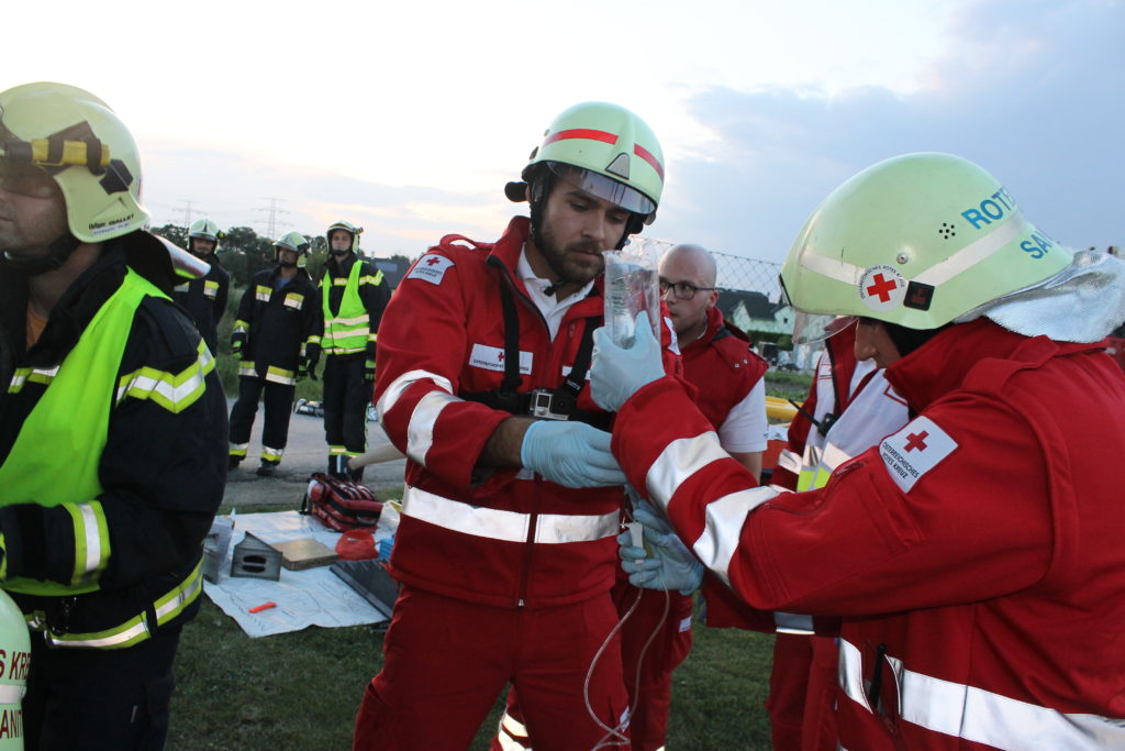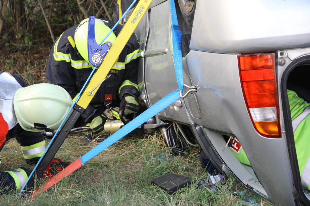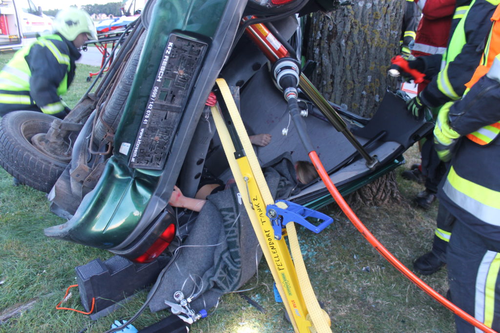 Der Rettungstrupp der Feuerwehr Pellendorf spreizt mit dem hydraulischen Rettungsgerät die Öffnung der Hecktüre und eröffnet damit dem Rettugnsdienst einen ersten Zugang. Der Notarzt legt einen Zugang bei einer Patientin über welchen eine Infusion infundiert wird.