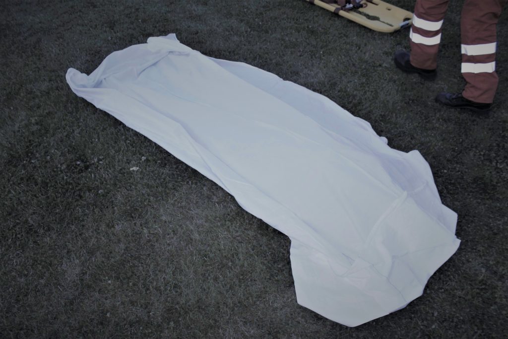 Die nächste Insassin die gerettet wird, ist jene ohne tastbaren Puls. Die Reihenfolge wird nicht wie üblich durch Triage festgestellt, sondern vielmehr durch die Platzierung in der Fahrerkabine. Die Patientin wird unter dem Stichwort „Crash-Rettung“ in Buachlage auf eine Schaufeltrage gezogen und weggebracht. Etwa 10 Meter von der Unfallstelle begutachtet der Notarzt die Patientin und stellt den Tod fest. Ein Sanitäter wird beauftragt eine 4-Kanal EKG Ableitung auszudrucken um die Epikrise den Richtlinien entsprechend dokumentieren zu können.