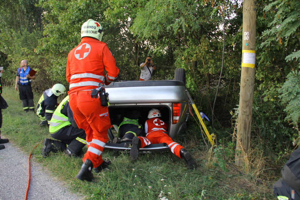 Nun trifft das Rüstlöschfahrzeug der benachbarten Feuerwehr ein. Der Gruppenkommandant meldet sich beim Einsatzleiter, dieser gibt den Befehl zum Brandschutz und dem Bereitstellen eines hydraulische Gerätesatzes. Aufgrund der Lage des Fahrzeuges und möglicher Durchtrennung der B-Säule entscheidet sich der Rettungstrupp in Absprache mit dem Einsatzleiter zur Stabilisierung mittels StabFast. Noch bevor das Fahrzeug endgültig gesichert ist, trifft der erste Rettungswagen, der RTW Schwechat 77/098, ein. Die Sanitäter machen sich ein Bild der Lage und bauen ihrerseits einen Ablageplatz vor.